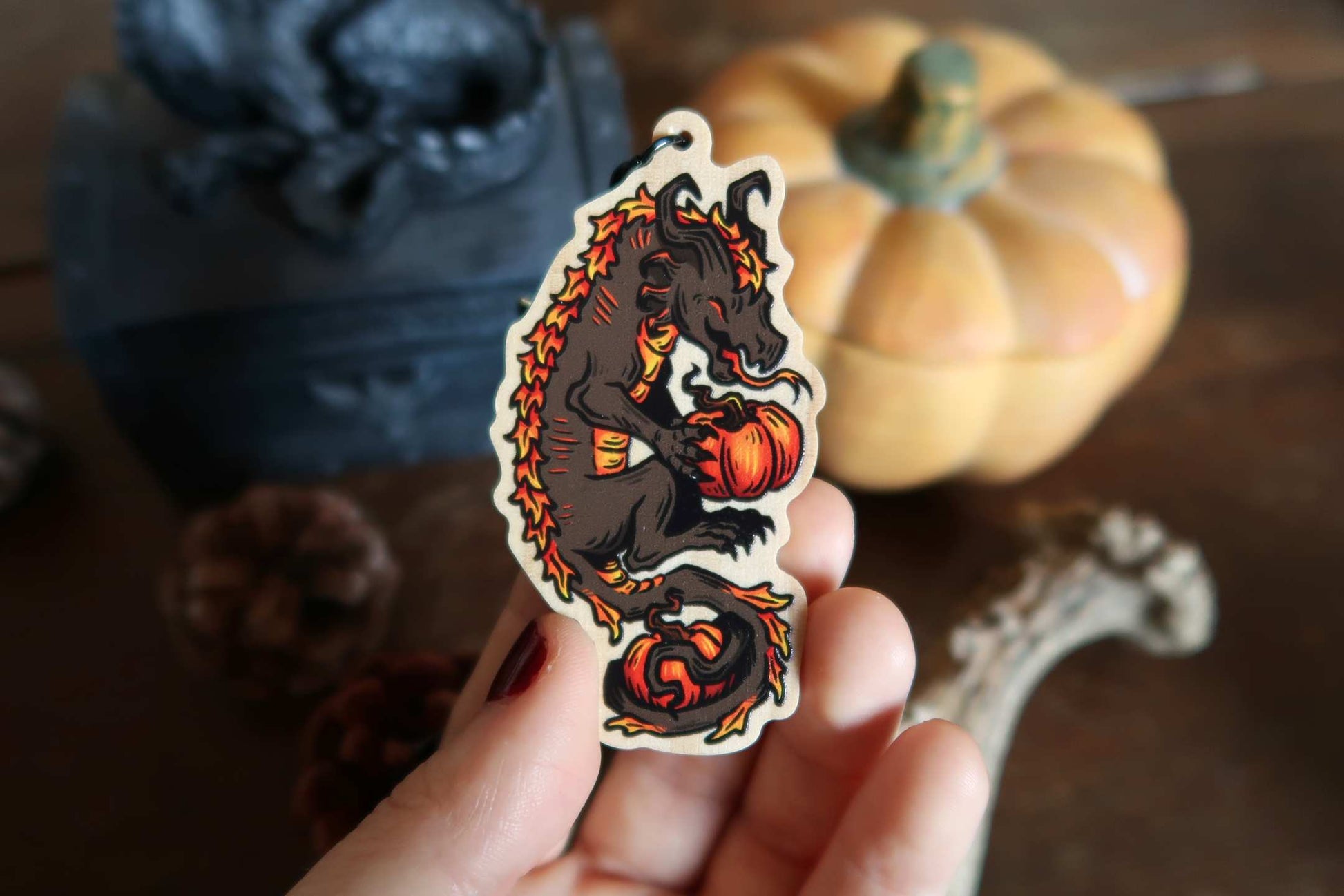 Double-sided Pumpkin dragon keychain, printed on pine with a bat hook clasp.